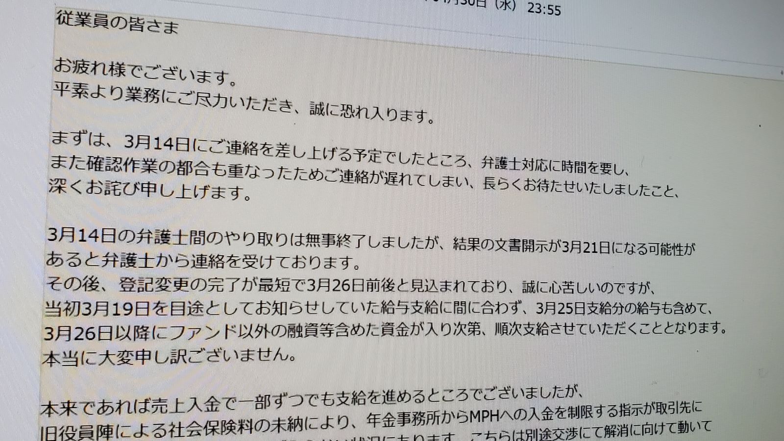 記事に戻る 〈新展開〉脱毛サロン大手「ミュゼプラチナム」で給与遅延や未払いが長引く。従業員の怒り爆発で全店営業を一時休止の方針の写真一覧 下に画像が続きます 「給与支給に関するご案内とお詫び」とのタイトルで従業員に状況を説明(編集部撮影) 2/2