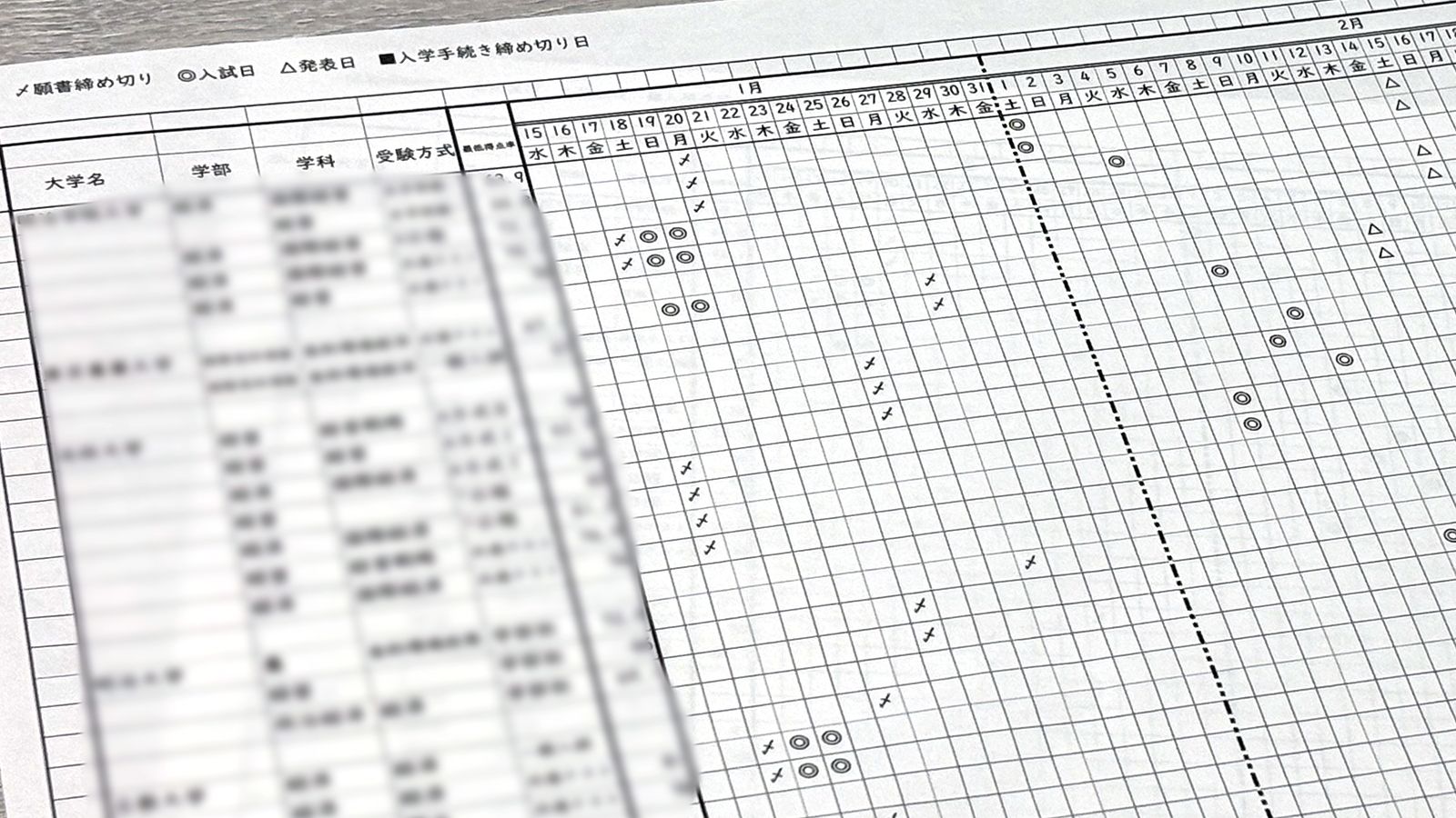 記事に戻る 地方の進学校から東京の私大を受験、娘の夢を叶えるために奔走した母親の回顧。現役合格を目指して22回受験、SNSに不安を吐露の写真一覧 下に画像が続きます 母親が作成したスケジュール(写真:編集部撮影、一部を加工しています) 2/2