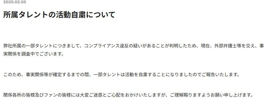 タレント名を明かさない形で活動自粛を発表、話題となった(画像:吉本興業ホールディングスHPより)