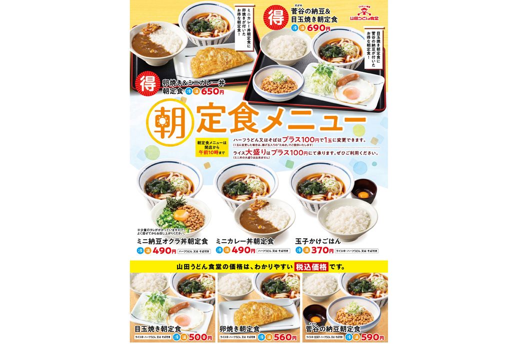 記事に戻る 「23区に店舗なし」「半数以上が埼玉」な最強うどんチェーン「山田うどん食堂」。「早い!安い!うまい!腹いっぱい!」に嘘偽りナシな"実態"の写真一覧 安くてボリューミーな山田うどんのモーニング(筆者撮影) 1/15 下に画像が続きます 山田うどんの朝メニューは8種類(公式ホームページより引用) 2/15