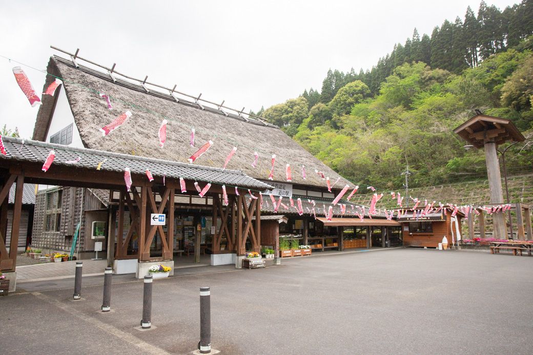 茅葺屋根があたりの風景と調和する道の駅酒谷。訪れたのは4月末だったため、こいのぼりが飾られていた(筆者撮影)