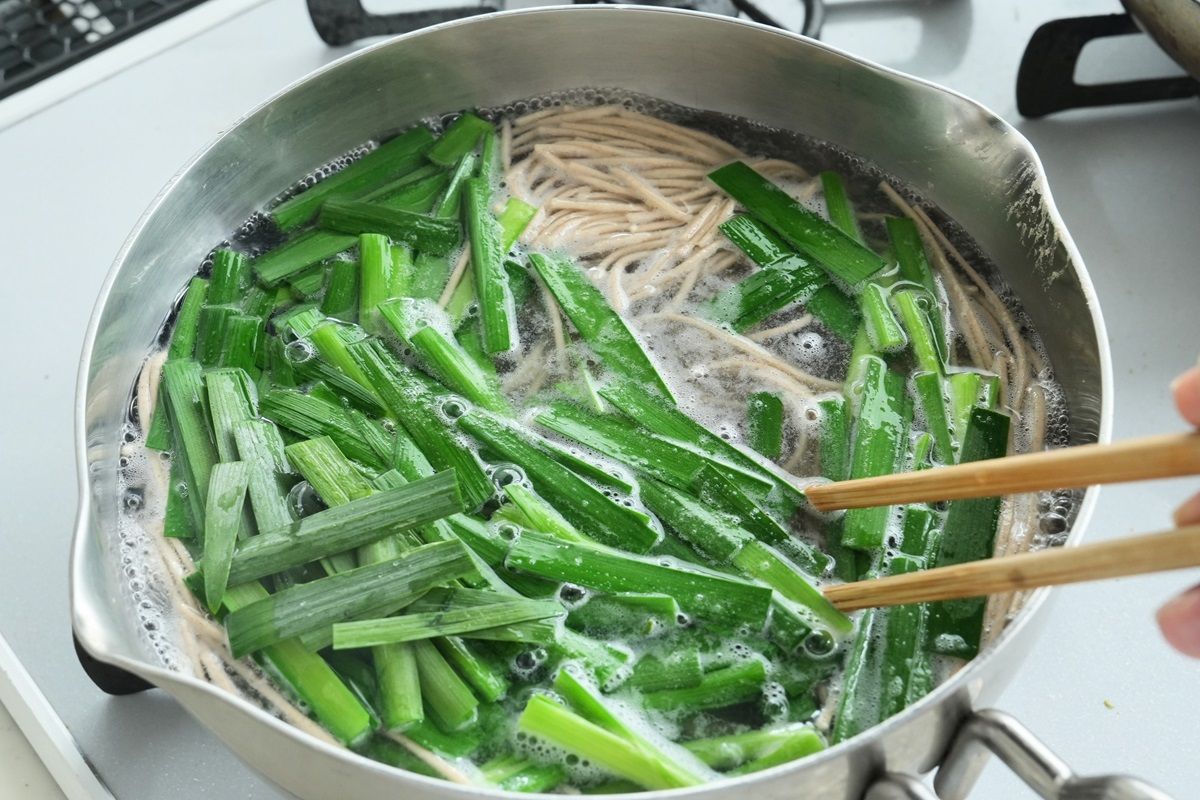 記事に戻る 初夏のランチにガツンと涼感を味わえる栃木・鹿沼名物「ニラそば」を自宅で作る極意の写真一覧 下に画像が続きます ゆで上がりの2分前にニラを加えて一緒にゆでましょう。時々、箸でかき混ぜます 10/13
