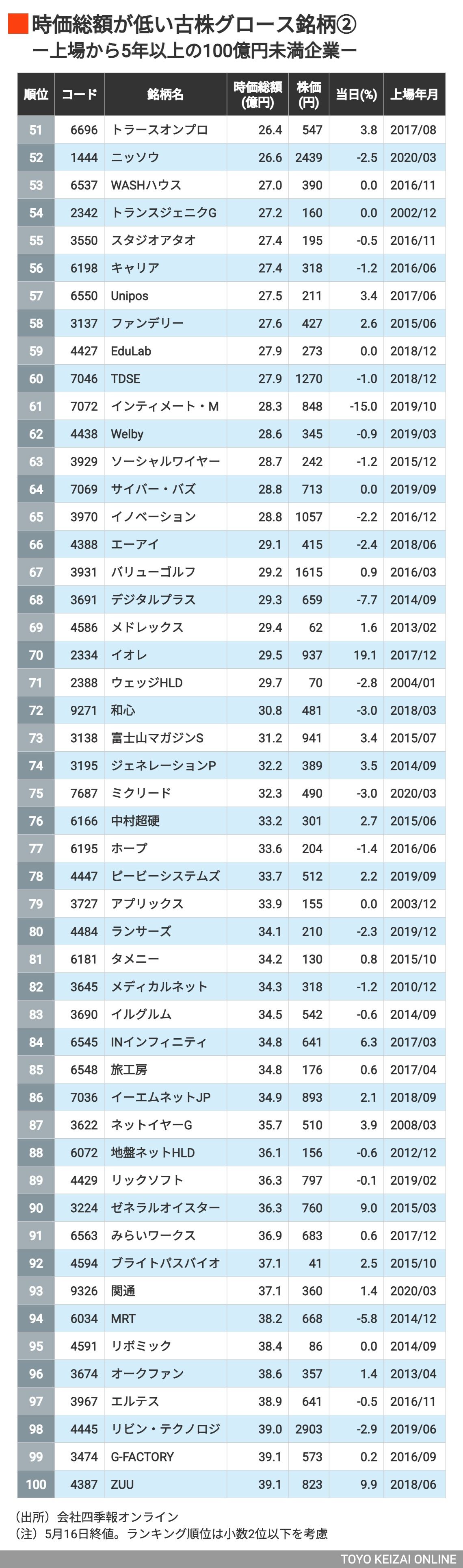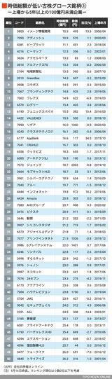 東証グロースに適用される「上場5年経過後に時価総額100億円」の関門。このルールが今すぐ適用されたとの仮定で退出を迫られる201社は?の写真一覧