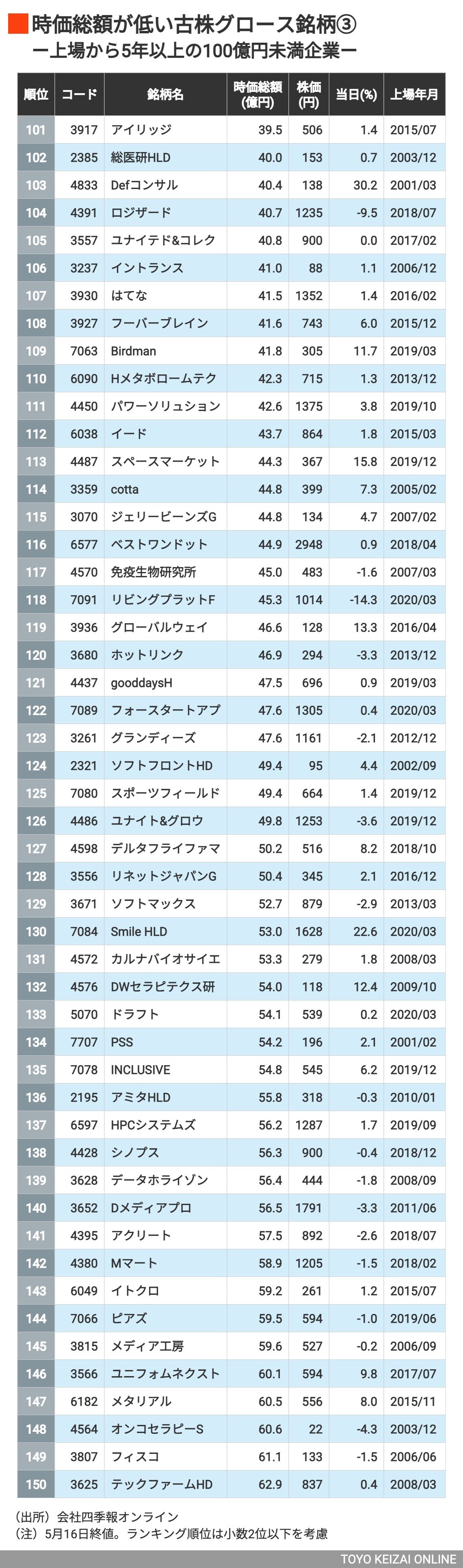 東証グロースに適用される「上場5年経過後に時価総額100億円」の関門。このルールが今すぐ適用されたとの仮定で退出を迫られる201社は?の写真一覧