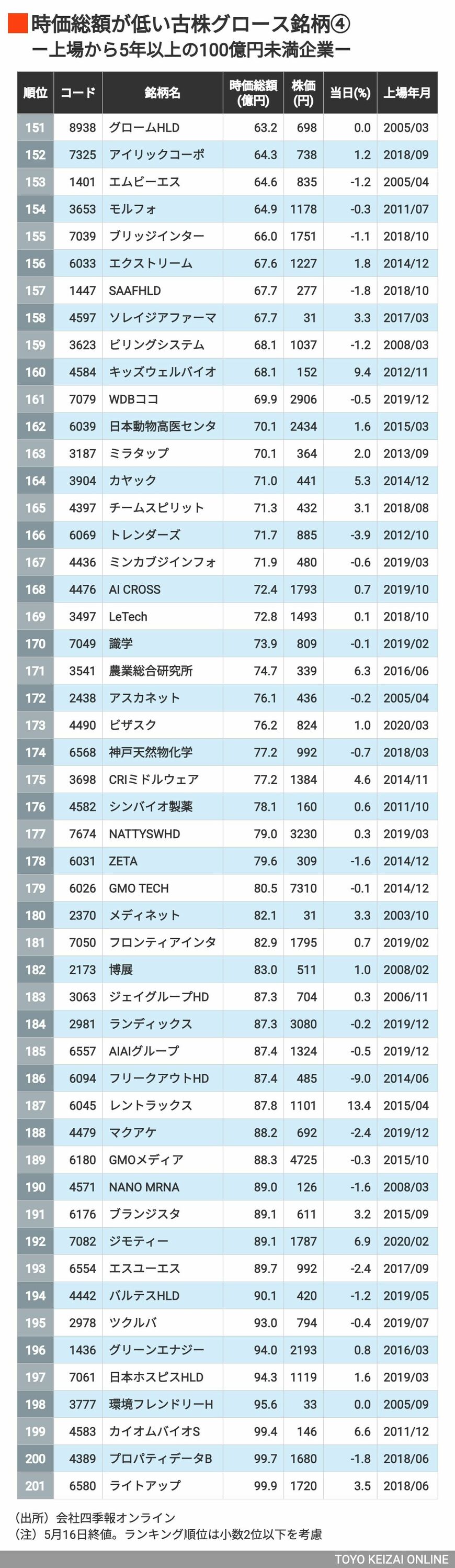 東証グロースに適用される「上場5年経過後に時価総額100億円」の関門。このルールが今すぐ適用されたとの仮定で退出を迫られる201社は?の写真一覧