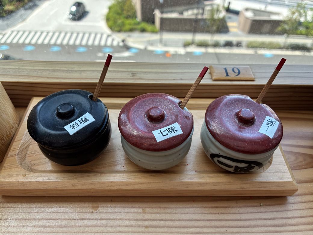 記事に戻る 「床に貝殻捨て放題」に関西人も驚く《行列天ぷらチェーン》がウメキタに! こんなおしゃれな空間でお手頃ランチを食べられちゃうんですか?の写真一覧 下に画像が続きます 卓上には岩塩、七味、一味がスタンバイ 22/30