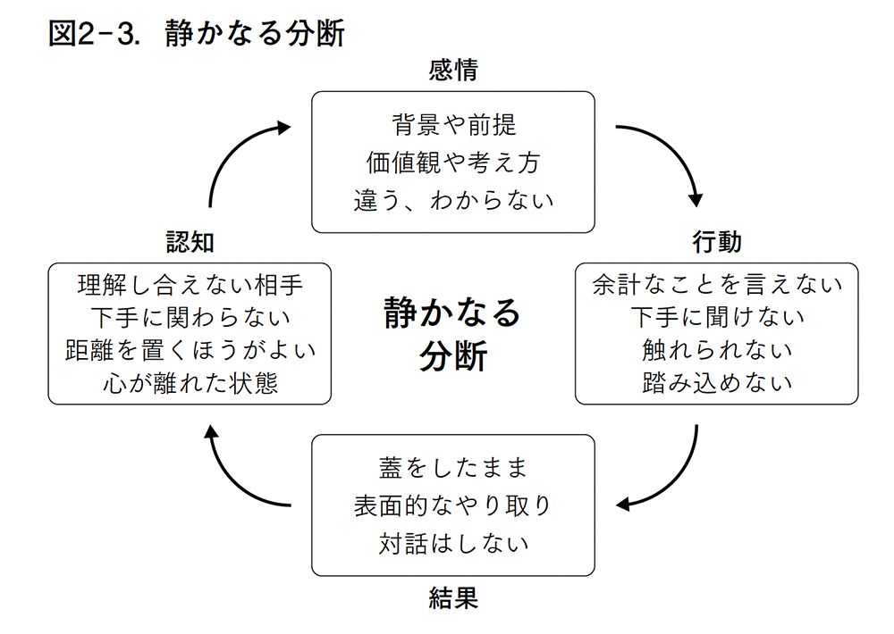 静かに分断する職場のイメージ(画像:『静かに分断する職場 なぜ、社員の心が離れていくのか』)