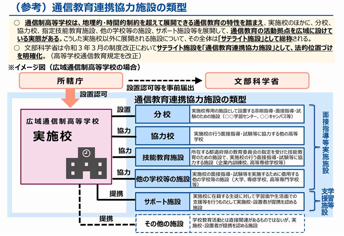 記事に戻る 4万3000人が利用、"学校ではない"「通信制サポート校」を選ぶうえで注意すべきこと いまだ「学校であるかのような広告宣伝」も散見の写真一覧 下に画像が続きます 本稿は広く認知されている通称“サポート校”で記載を統一しているが、上図のとおり文科省は“サポート施設”と表現し、「学習等支援施設」であることを明確にしている (出所)文部科学省「新時代に対応した高等学校教育に関する制度改正(令和3年)」参考資料 3/3