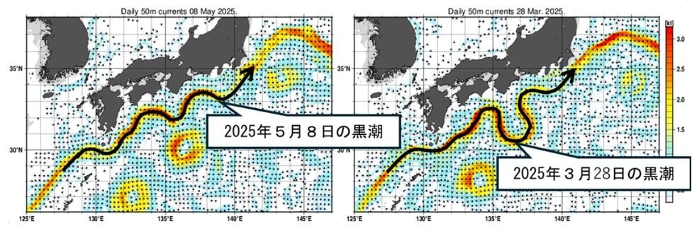黒潮大蛇行解消(2025年5月)と黒潮大蛇行(同3月) (出所:気象庁)