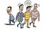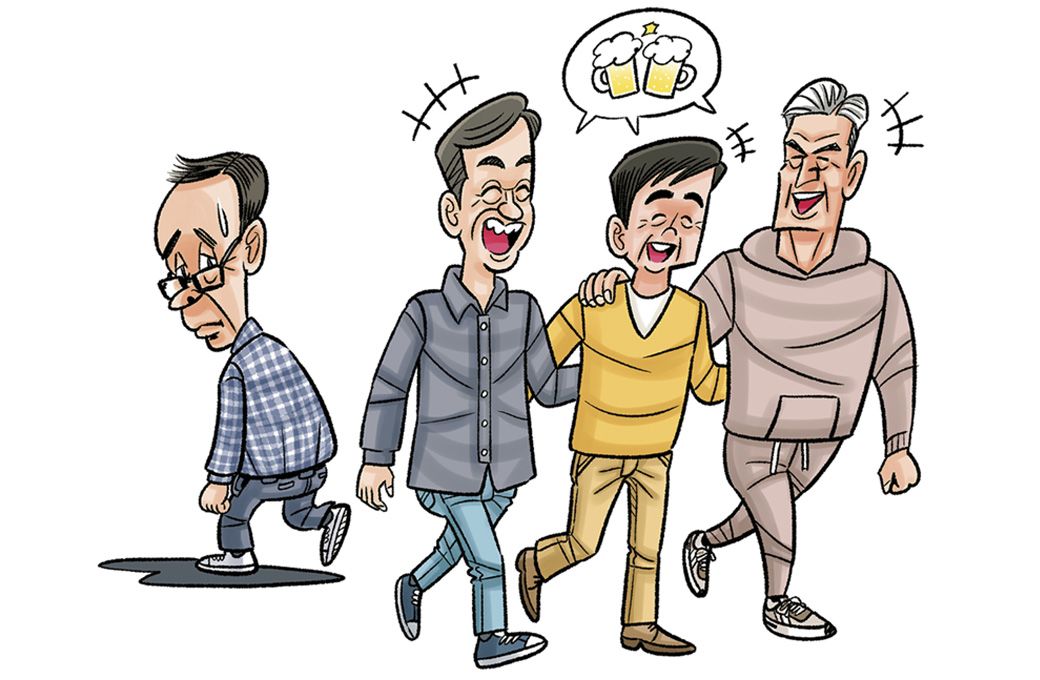 仲の良い三人のシニア男性たちと孤独なシニア男性のイラスト