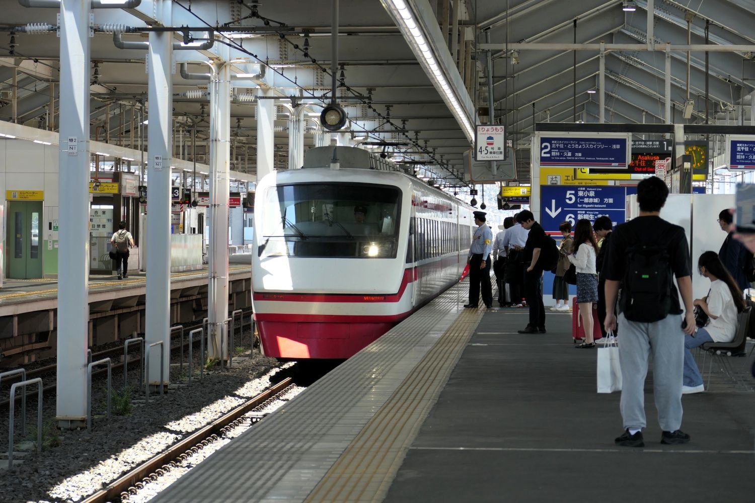 浅草行きの特急「りょうもう」が入線(記者撮影)