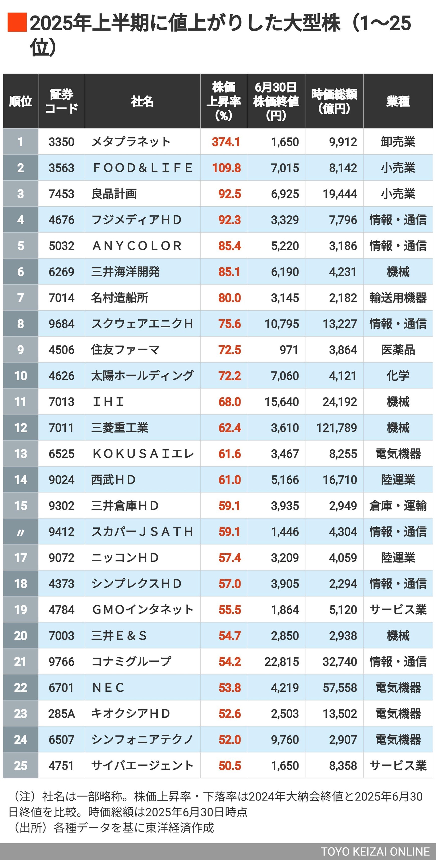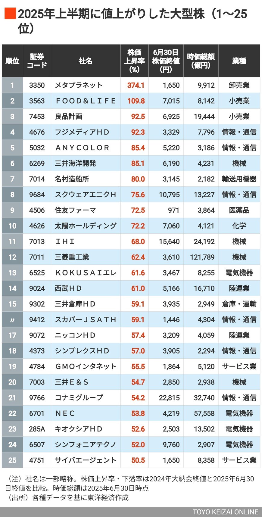 3位は無印、2位がスシロー、では1位は? 2025年上半期に株価が上昇&下落した「大型株」ランキング100+100社の写真一覧
