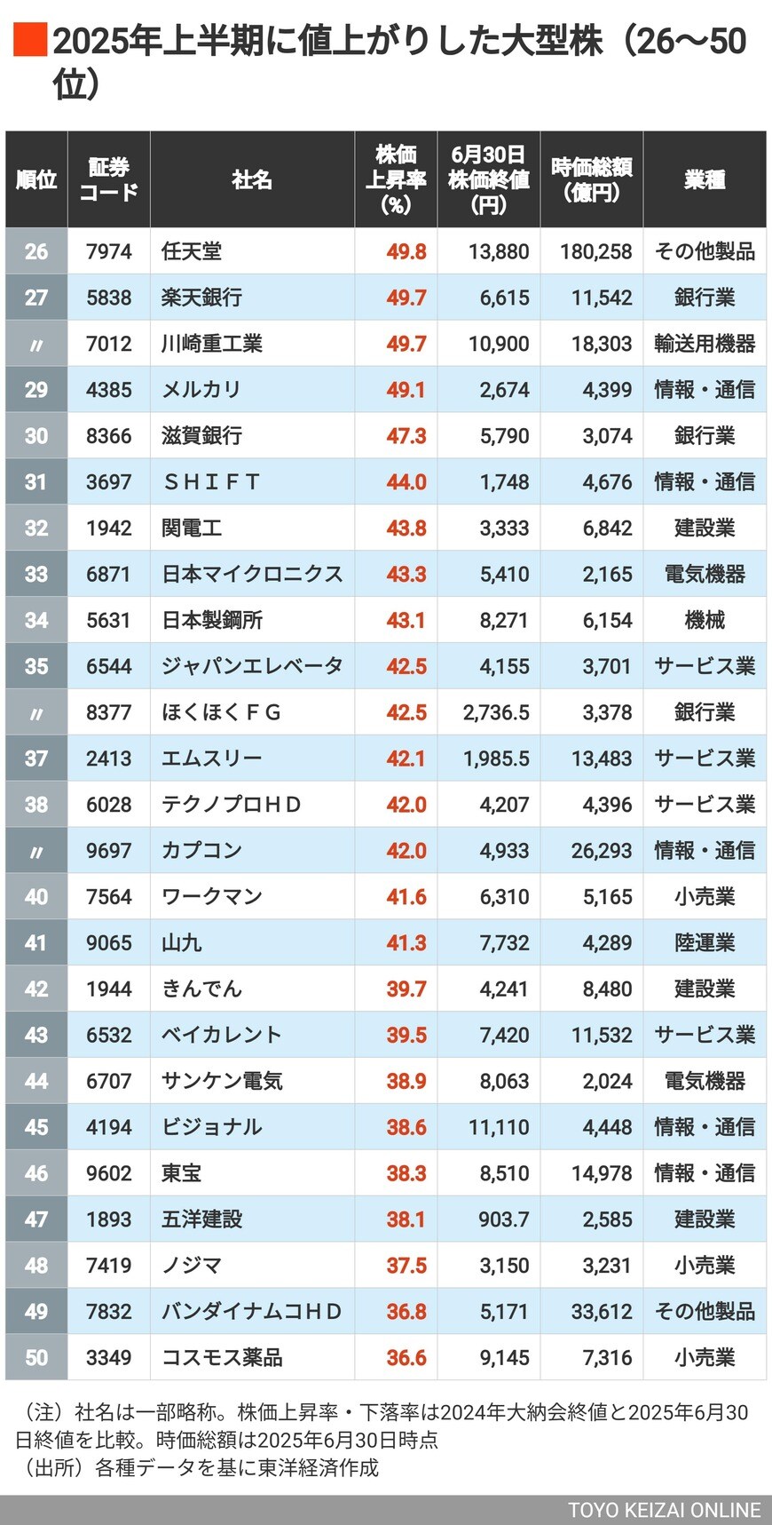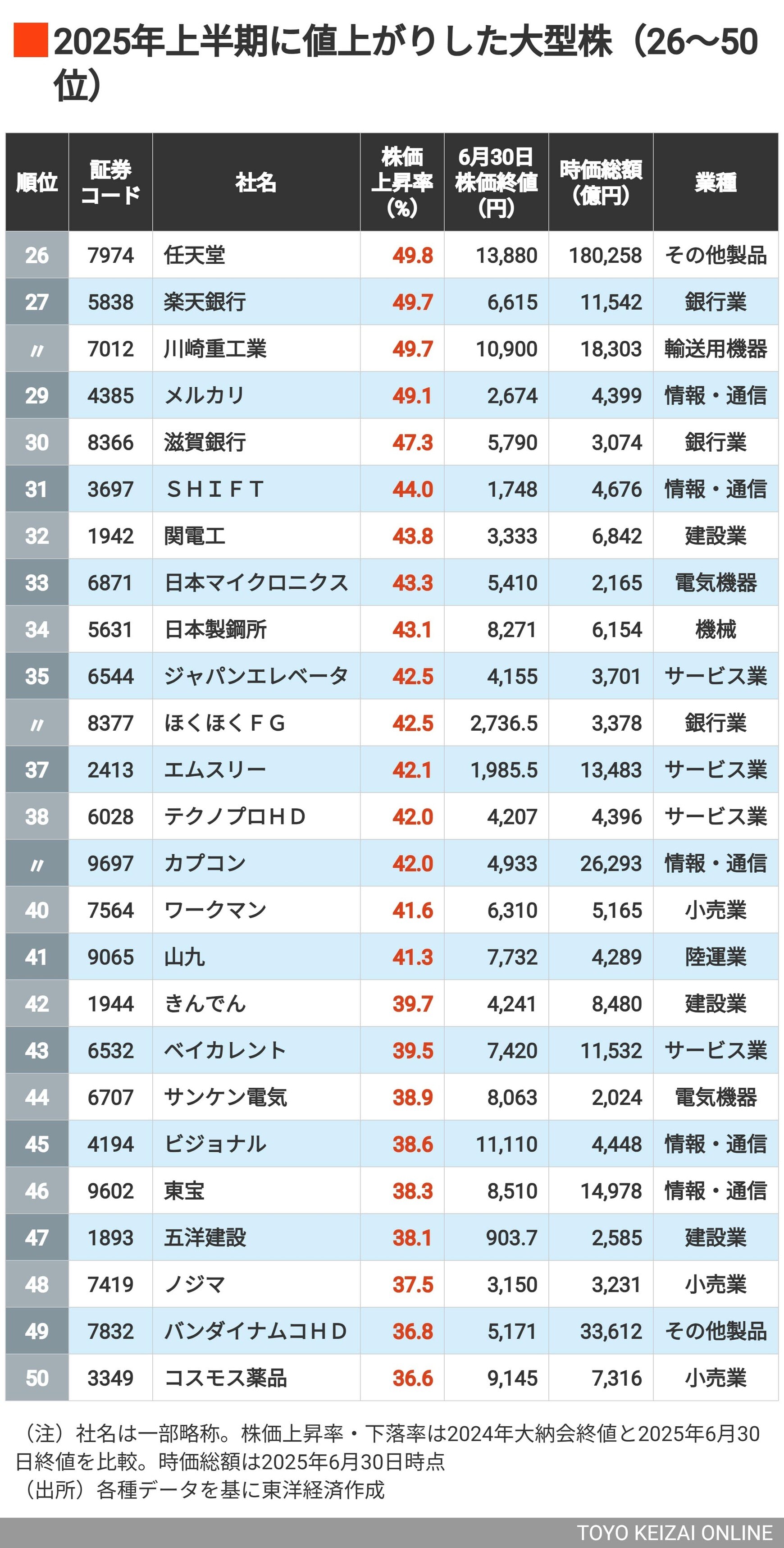 3位は無印、2位がスシロー、では1位は? 2025年上半期に株価が上昇&下落した「大型株」ランキング100+100社の写真一覧