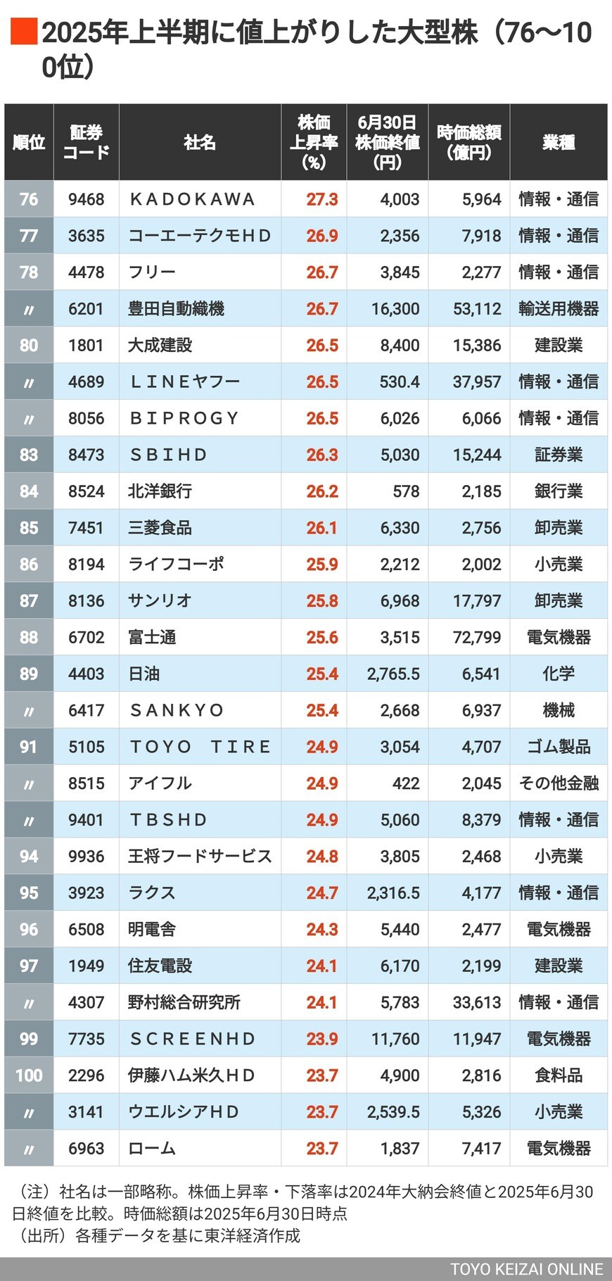3位は無印、2位がスシロー、では1位は? 2025年上半期に株価が上昇&下落した「大型株」ランキング100+100社の写真一覧