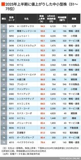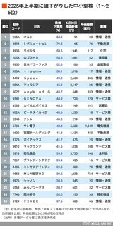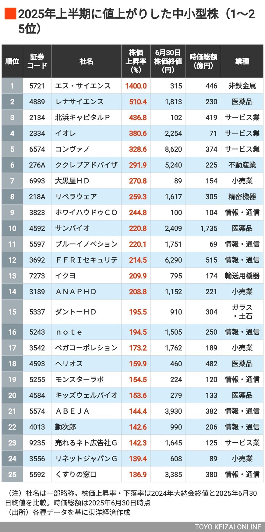 株価2倍超は46銘柄、トップは驚きの15倍高! 2025年上半期に株価が上昇&下落した「中小型株」ランキング100+100社の写真一覧