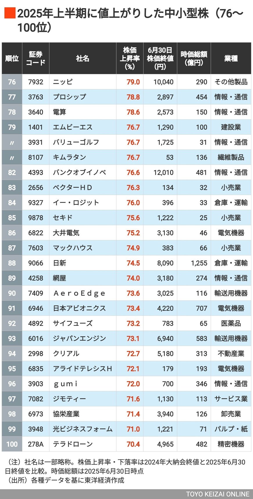 株価2倍超は46銘柄、トップは驚きの15倍高! 2025年上半期に株価が上昇&下落した「中小型株」ランキング100+100社の写真一覧