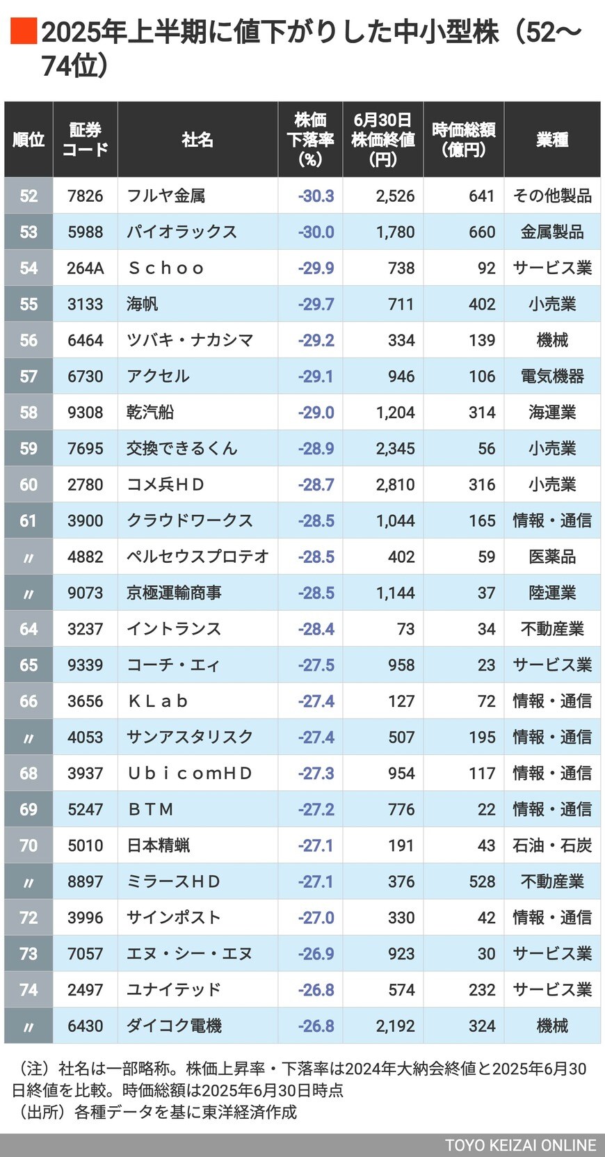株価2倍超は46銘柄、トップは驚きの15倍高! 2025年上半期に株価が上昇&下落した「中小型株」ランキング100+100社の写真一覧