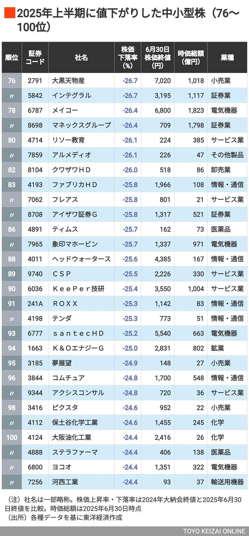 株価2倍超は46銘柄、トップは驚きの15倍高! 2025年上半期に株価が上昇&下落した「中小型株」ランキング100+100社の写真一覧