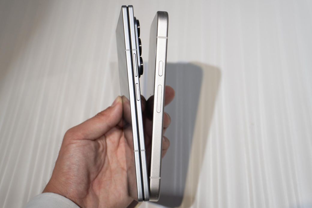 記事に戻る サムスンが「開く」新時代スマホ体験──折りたたみの弱点だった“厚み”と“重さ”を克服したGalaxy Z Fold7・Flip7を発表の写真一覧 日本で発売される折りたたみスマホとして最薄を実現した「Galaxy Z Fold7」(筆者撮影) 1/9 下に画像が続きます 左がGalaxy Z Fold7、右は一般的な形状のハイエンドスマホPixel 9 Pro。厚みはほぼ変わらない(筆者撮影) 2/9
