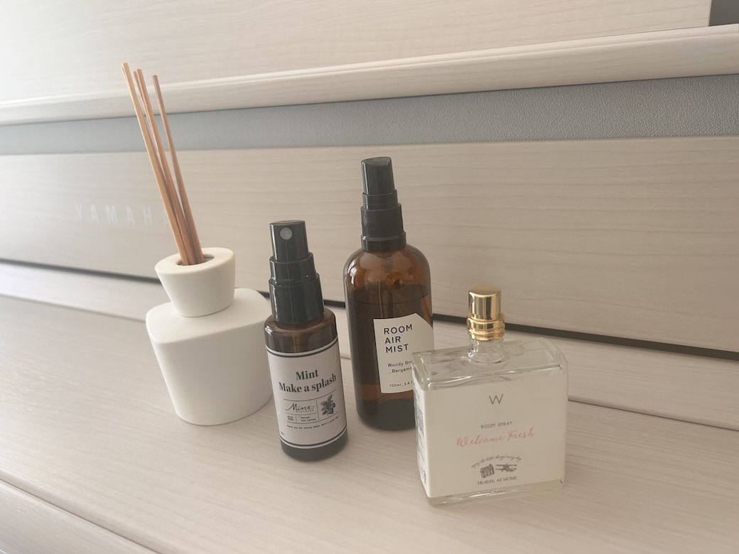 香りのアイテムは各種用意している。「アヴェダ」の「チャクラバランシングミスト」や「ニールズヤード・レメディーズ」の「メディテーションインセンス」などはメディテーションのために作られているので相性がいいし、スイッチが入りやすい(筆者撮影)