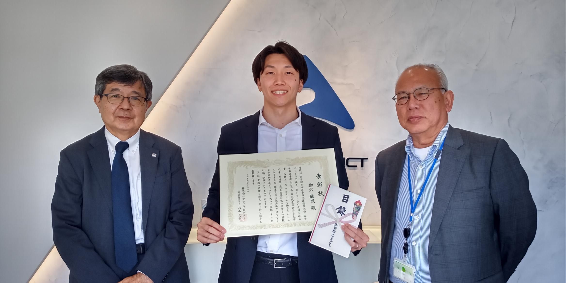 記事に戻る 《世界水泳2025》栁沢駿成(27)「仕事終わりに260円の市民プールへ…」大学卒業後に一度は水泳を諦めた営業マンが日本代表になったワケの写真一覧 2025年3月、日本選手権での表彰式後、撮影に応じる栁沢さん(左端)(写真:栁沢さん提供) 1/6 下に画像が続きます 世界水泳の日本代表となり、勤務先から表彰された栁沢さん。左は代表取締役社長の杉山 文章さん、右は常務取締役の西ノ明 武さん(写真:栁沢さん提供) 2/6
