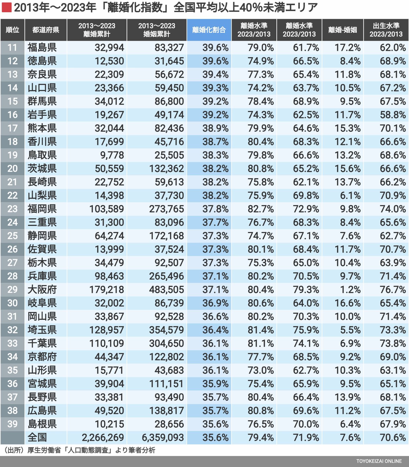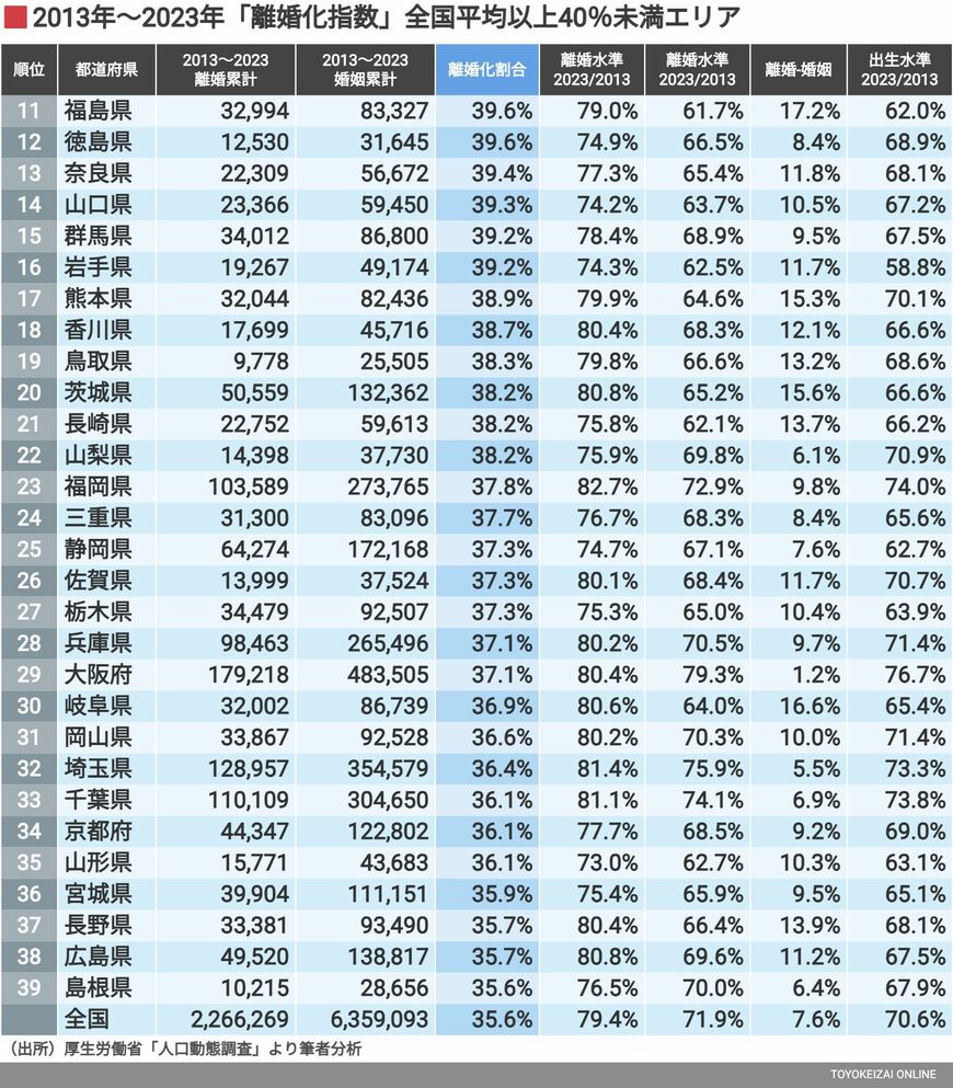 離婚が増えていると感じる昨今、その背景をエビデンスに基づいて分析した「離婚化指数」ランキングが明らかにします。地域ごとに異なる離婚率や結婚数、若者の流出による少子化の実態とは?感情論では語れない、離婚と結婚のリアルな日本社会の姿に迫ります。あなたの地元はどうなっているのでしょうか。