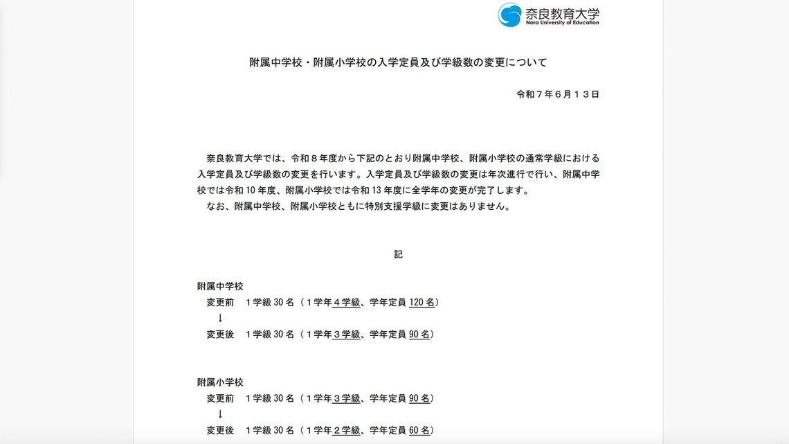 今年6月、奈良教育大学附属小学校は「このたび奈良教育大学の決定により、附属小学校の入学定員及び学級…