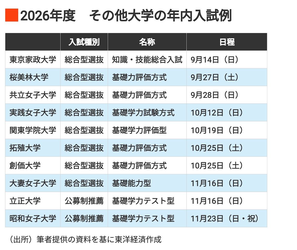 記事に戻る 大学の年内学力入試、関東でも「今年も実施」の条件と各大学の配点など<動向まとめ> 学科試験計200点、小論文と調査書は各10点もの写真一覧 例えば、東京家政大学は9月14日、桜美林大学は9月27日、共立女子大学は9月28日と、9月に年内学力試験を行う大学も存在する 1/2 下に画像が続きます 2026年度年内入試の各大学(記事で触れている東洋大学、神奈川大学、大東文化大学)の動向。大東文化大学は、入学金の納入締め切りが2月25日までのため、他大学の一般選抜の結果を見てから決断することができる 2/2