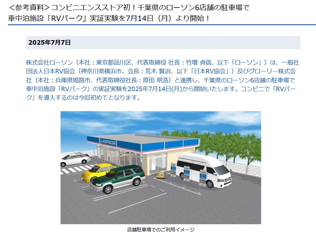 コンビニ大手ローソンが車中泊施設「RVパーク」事業に参入し、全国展開も見据えた新たな挑戦に乗り出しました。急拡大する車中泊市場に目を付けた背景や、ほぼ追加投資なしで駐車場を活用できる勝算とは?一方、マナー違反やごみ問題など課題も山積。ローソンの車中泊事業の行方はいかに——。