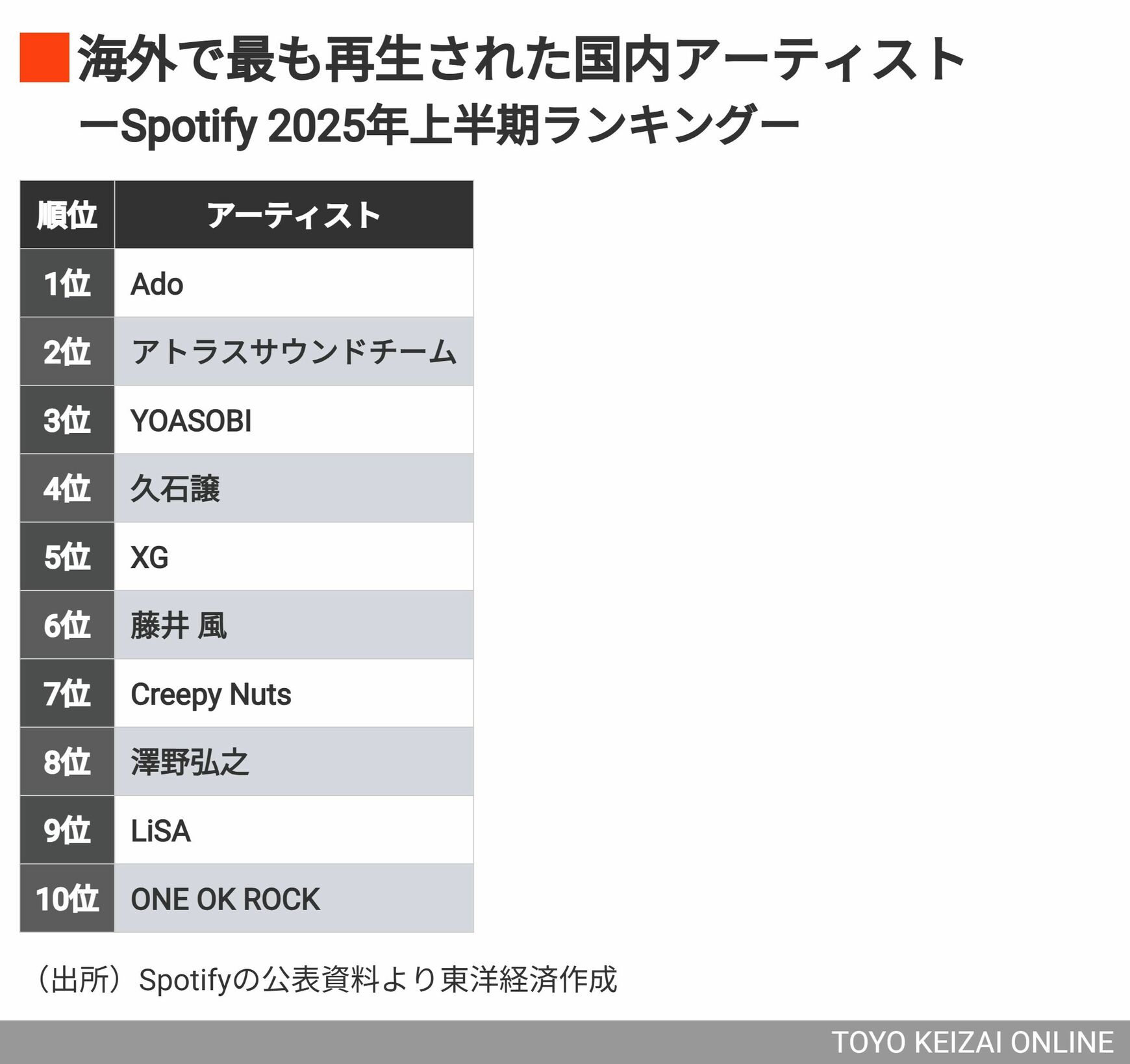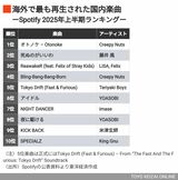 記事に戻る 【25年上期の「Spotifyランキング」トップ10】海外で最も再生された日本アーティストは《Ado》!《YOASOBI》の同部門“5連覇”阻んだ理由は?の写真一覧 Spotifyの2025年上半期ランキングが発表された。海外で最も再生された国内アーティスト/国内楽曲を分析すると、興味深い傾向が見えてきた(写真:prathanchorruangsak / PIXTA) 1/3 下に画像が続きます 2/3