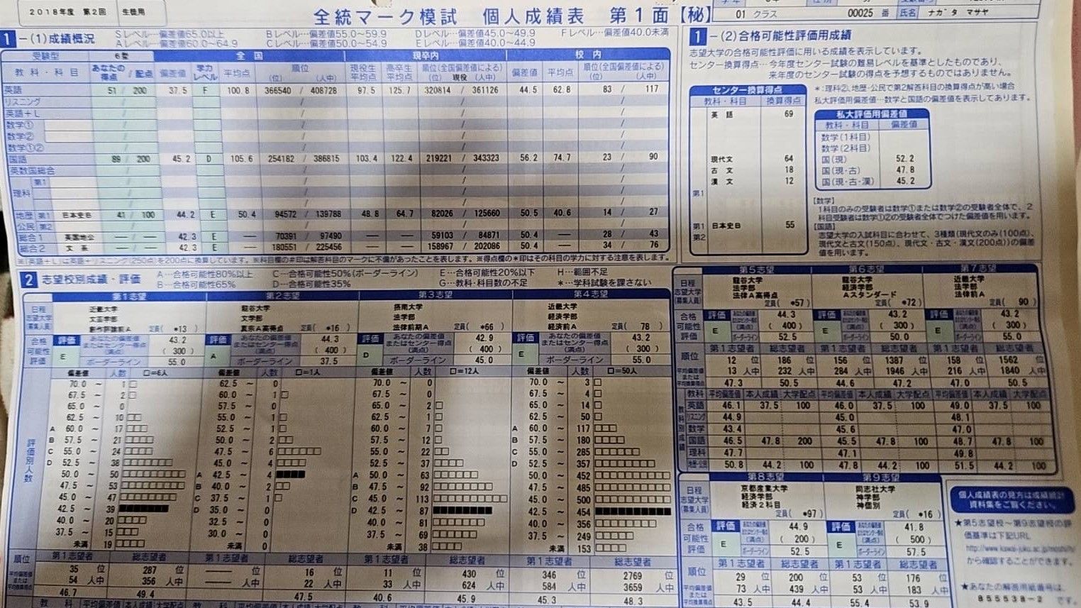 記事に戻る 英検利用で早稲田に合格“のんびりに見えて戦略的”だった彼の令和らしい受験体験の写真一覧 永田将也さん(写真:本人提供) 1/6 下に画像が続きます 高校時代の永田さんの模試の成績(写真:永田さん提供) 2/6