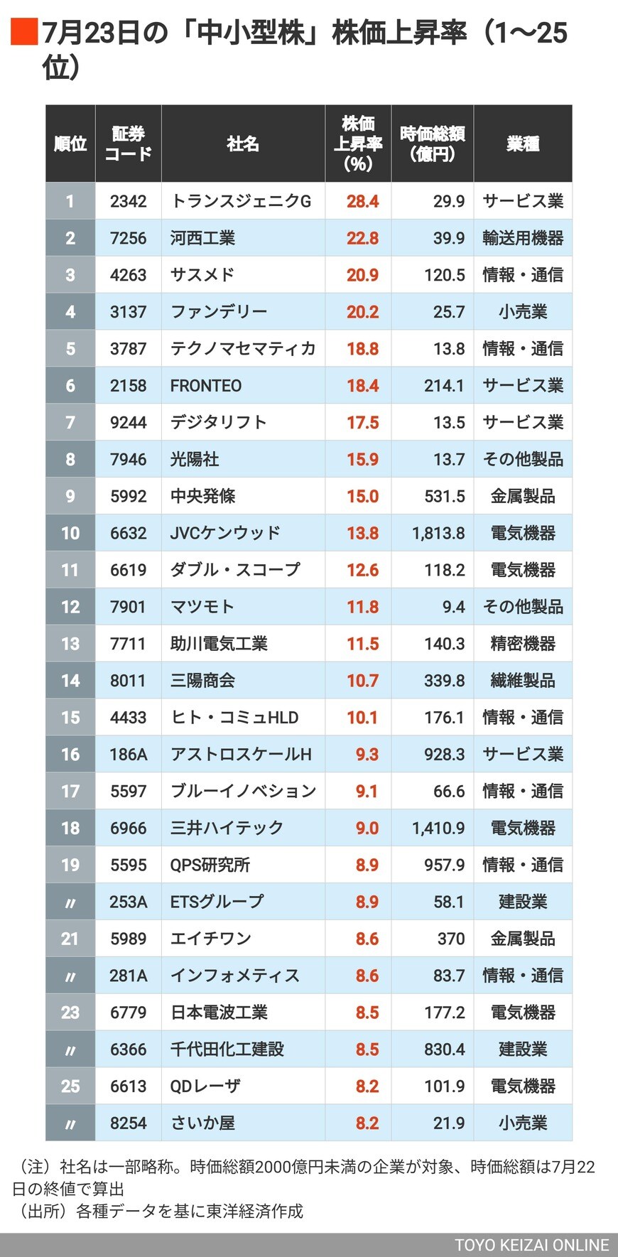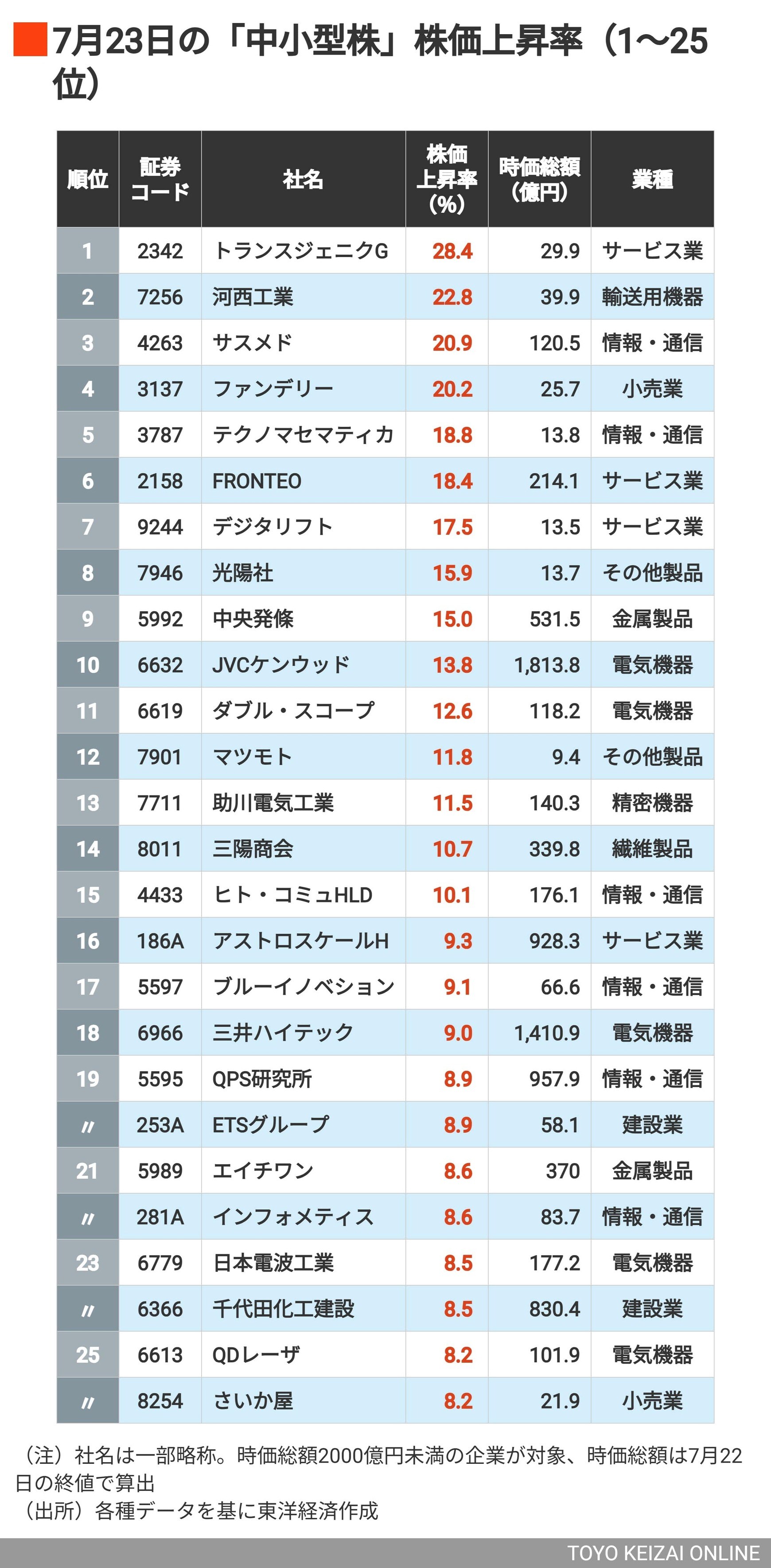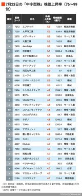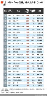 上昇率2桁は15銘柄、トップは28%超の値上がり! 日米交渉合意で株価が急騰した「中小型株」ランキングTOP100の写真一覧