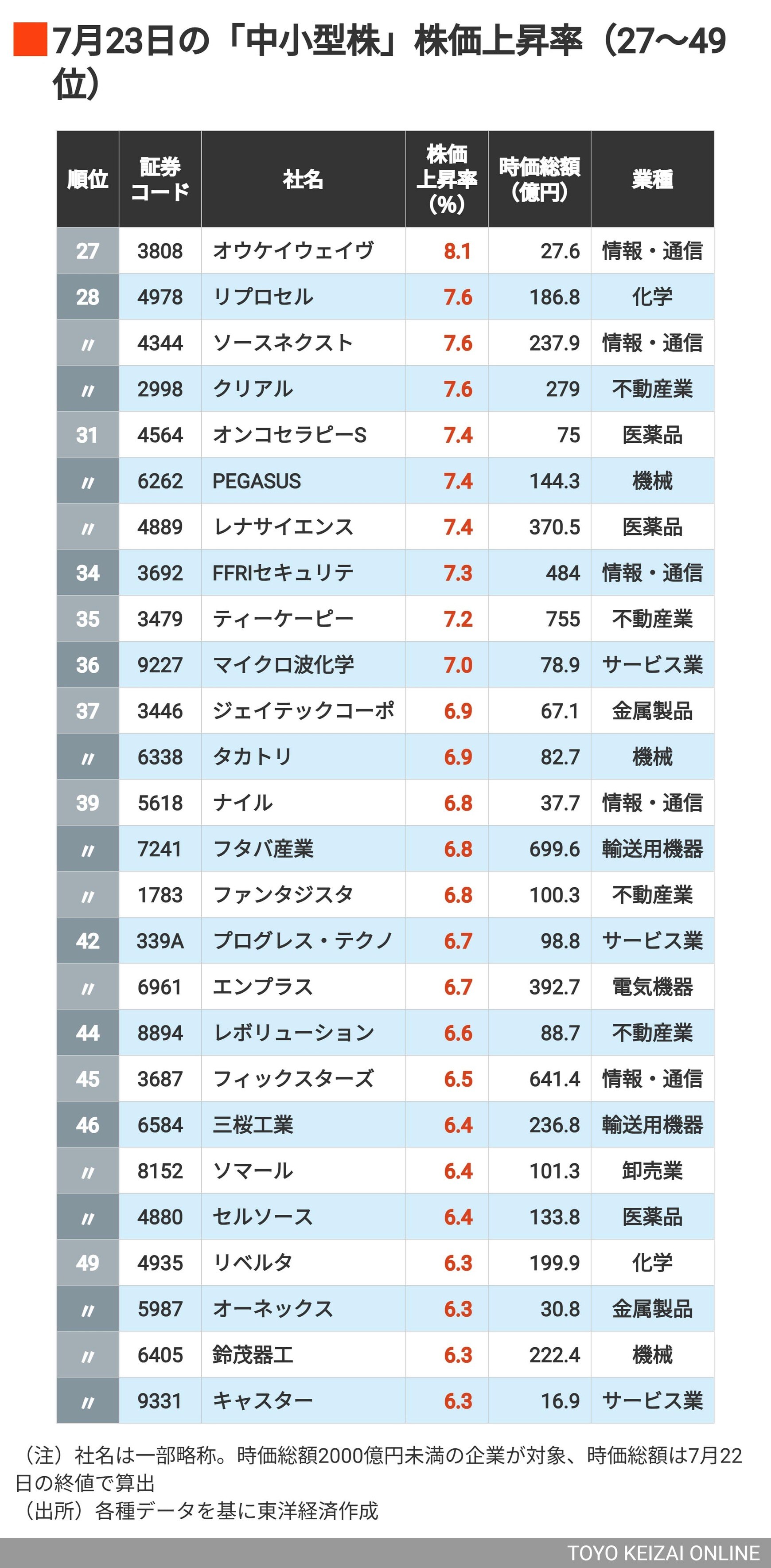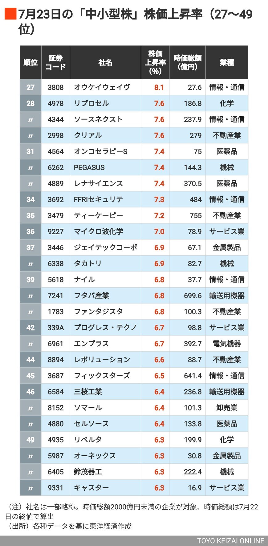 上昇率2桁は15銘柄、トップは28%超の値上がり! 日米交渉合意で株価が急騰した「中小型株」ランキングTOP100の写真一覧