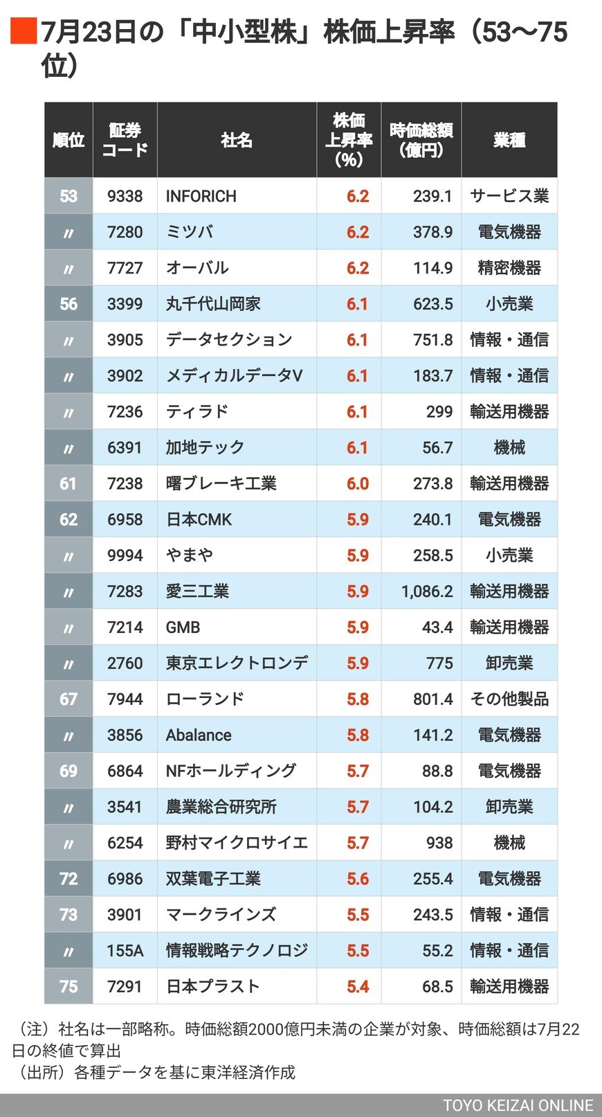 上昇率2桁は15銘柄、トップは28%超の値上がり! 日米交渉合意で株価が急騰した「中小型株」ランキングTOP100の写真一覧