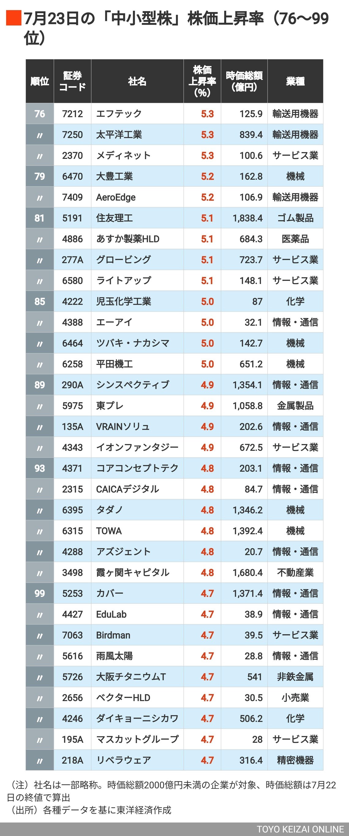 上昇率2桁は15銘柄、トップは28%超の値上がり! 日米交渉合意で株価が急騰した「中小型株」ランキングTOP100の写真一覧