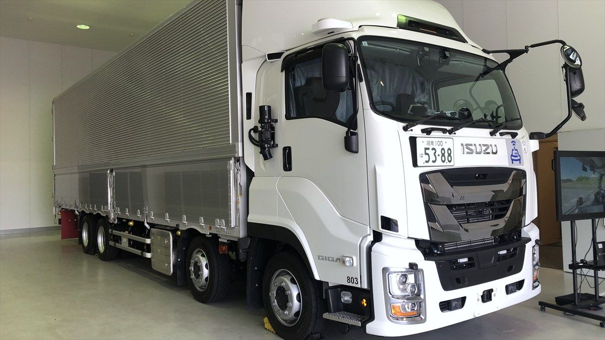 いすゞが7月末、同社藤沢工場で初公開した次世代自動運転大型トラック。 アメリカのIT系スタートアップらとの連携を強化した自動運転2.0仕様(筆者撮影)