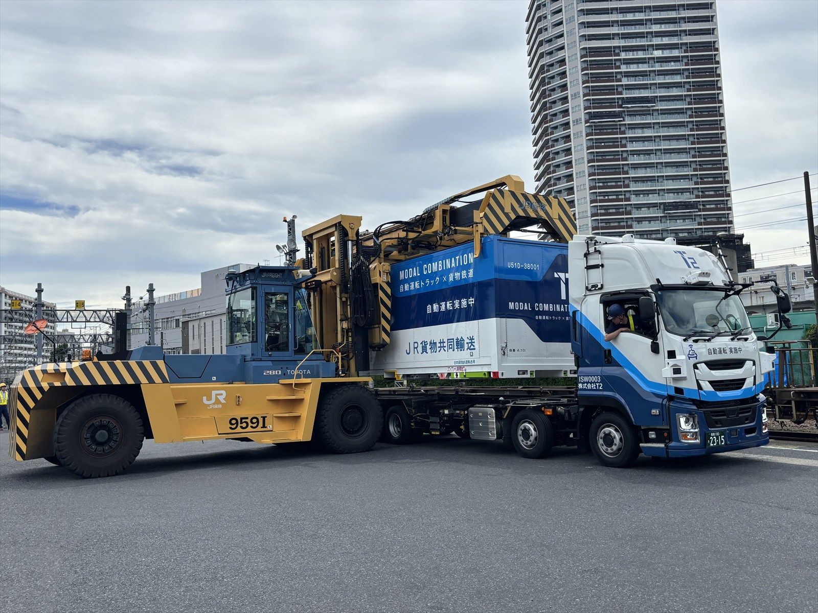JR貨物 隅田川駅でT2のトラックにコンテナを積載する様子(筆者撮影)