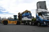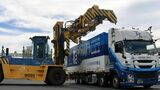 JR貨物と自動運転システム開発のT2などが行った実証実験の様子。自動運転トラックにコンテナを積む作業(記者撮影)