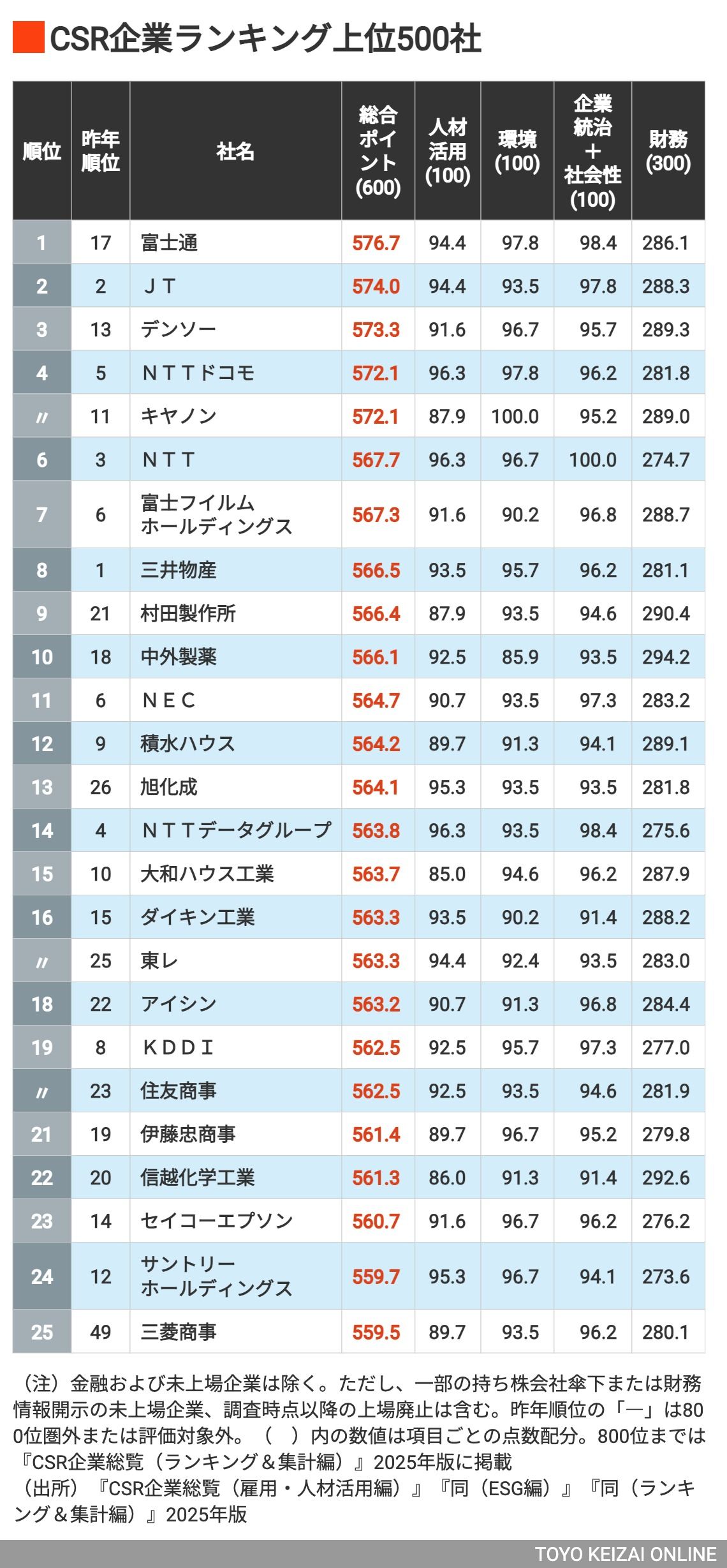 『週刊東洋経済』2025年3月8日号で上位300社まで発表した第19回「CSR企業ランキング」(2025年版)。今回…