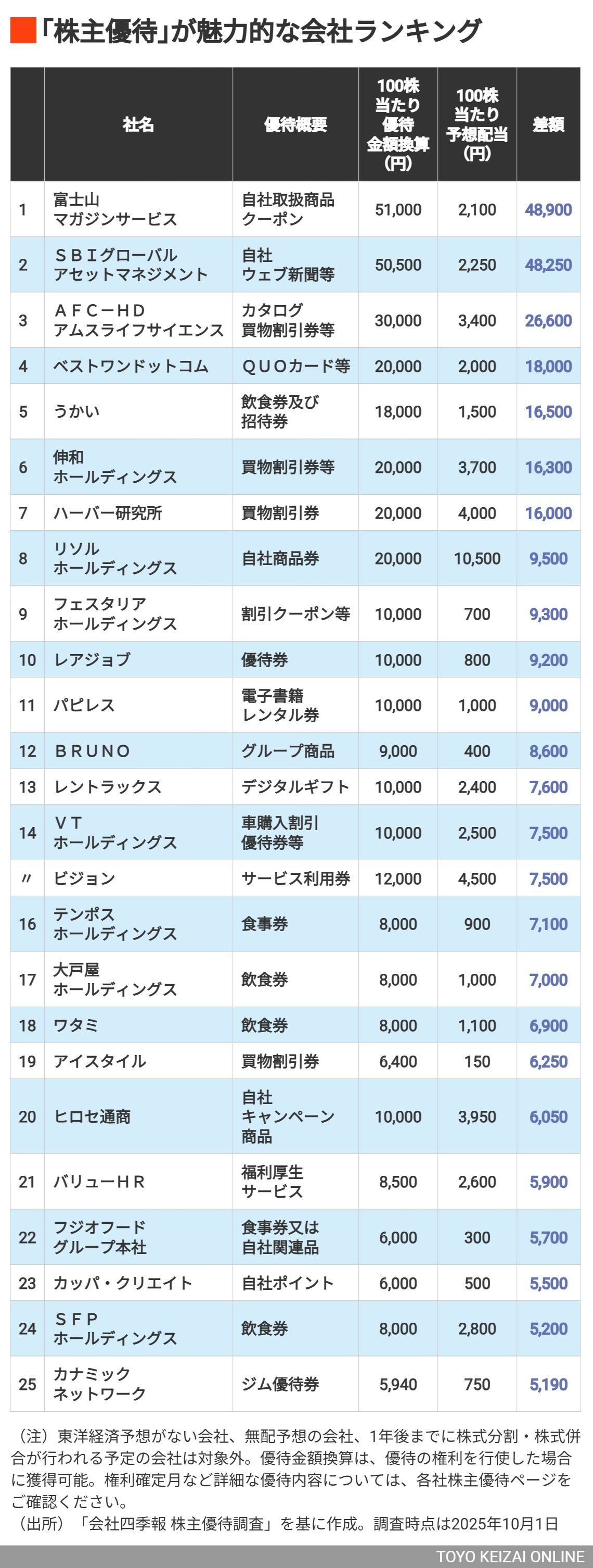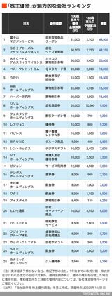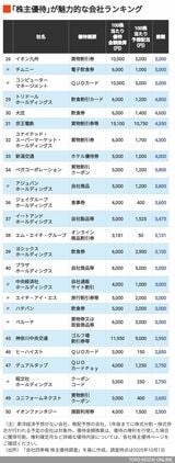 記事に戻る 株主優待の「現金換算額」が配当を"上回る"会社ランキング101 予想配当よりも大きい額のQUOカードがもらえる会社も…の写真一覧 株主優待を実施する会社の中には、配当金を超える金額の品物・サービスを実施するところも存在する(写真:genzoh/PIXTA) 1/5 下に画像が続きます 2/5