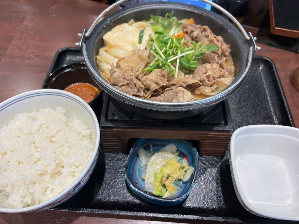 こちらが新メニュー「とんこつ醤油牛鍋膳」、税込899円(筆者撮影)