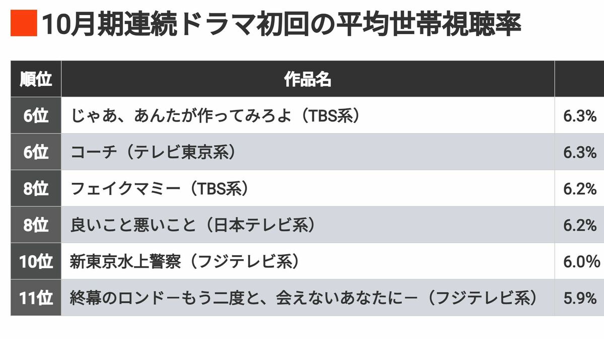25年《秋ドラマ初回視聴率ランキングTOP10》が示す「異変の兆し」。上位3作は"盤石"でも、中位以降は"大混戦"に!抜け出すのはどの作品?