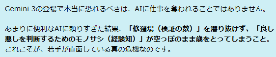 AIの進化に仕事を奪われる――そんな焦りを感じていませんか。Googleの「Gemini 3」に象徴される圧倒的な事務処理能力は、もはや人間の及ぶところではありません。しかし本当に危機にすべきなのはAIとの能力差ではなく、「自分自身の経験値」かもしれません。最先端AI時代に求められる人間の価値とは?(このリード文はAIが作成しました)