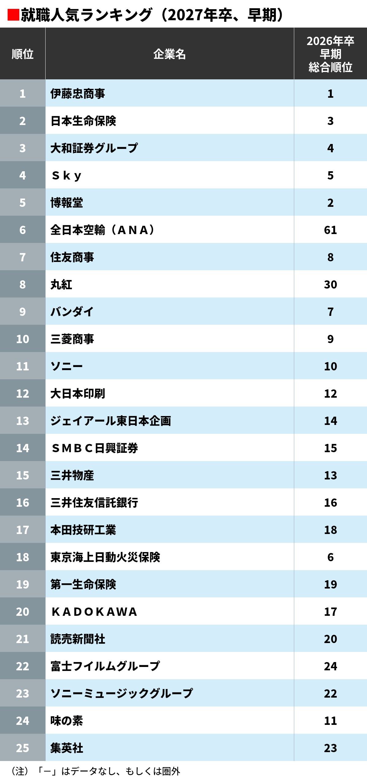 早期に動く就活生が選ぶ「就職人気企業ランキング」 10位三菱商事、9位バンダイ、8位丸紅、それより上位に入ったのは?