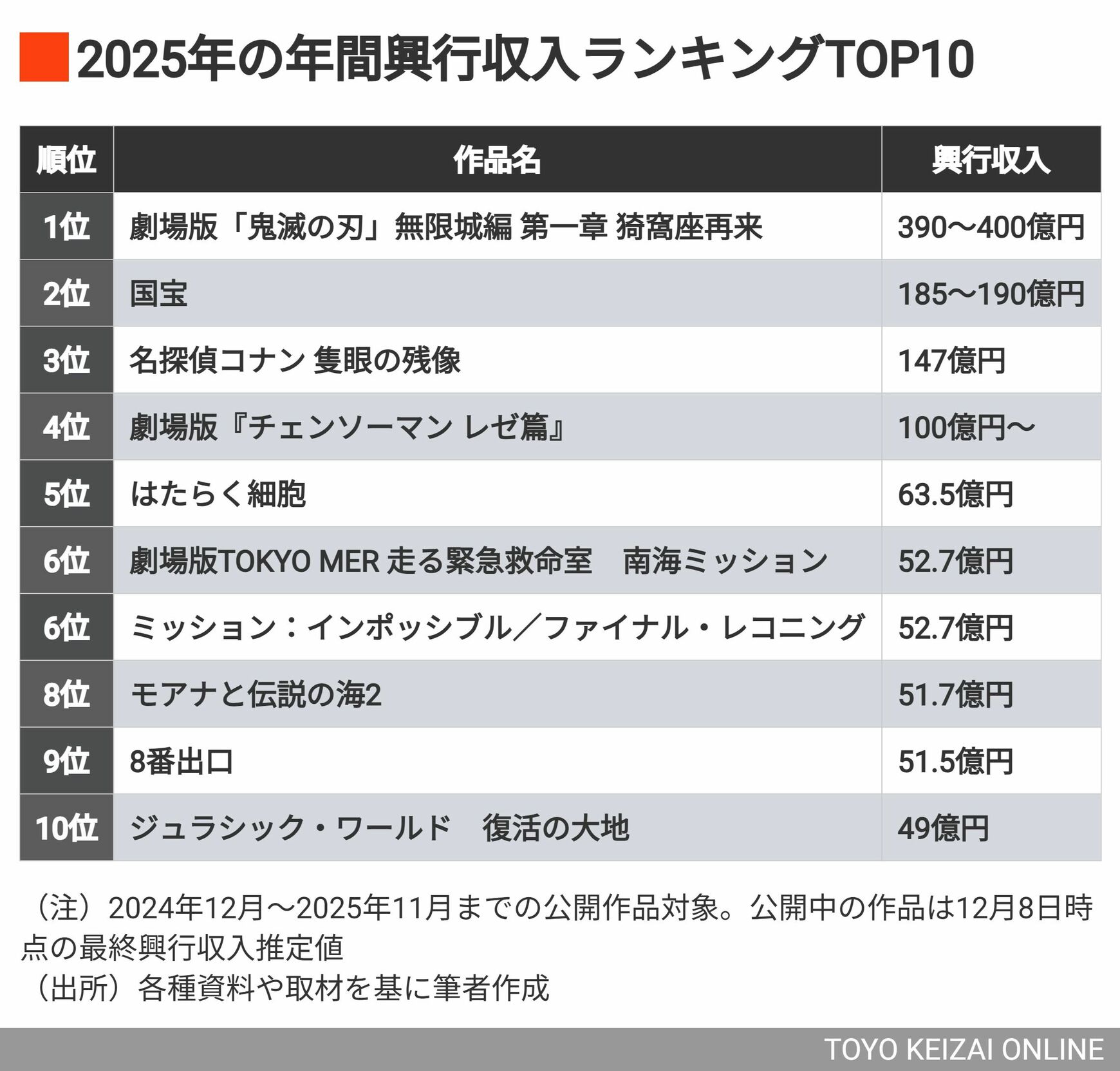 記事に戻る 25年の《映画興行収入ランキングTOP10》が示す「新たなヒット傾向」。『鬼滅の刃』『国宝』が牽引!アニメ人気は新局面、邦画実写でも動きがの写真一覧 スーパーヒットした『劇場版「鬼滅の刃」無限城編 第一章 猗窩座再来』。写真は十二鬼月・上弦の参である猗窩座。強大な力を持ち、炭治郎たちの前にたちはだかる(C)吾峠呼世晴/集英社・アニプレックス・ufotable 1/9 下に画像が続きます 2/9