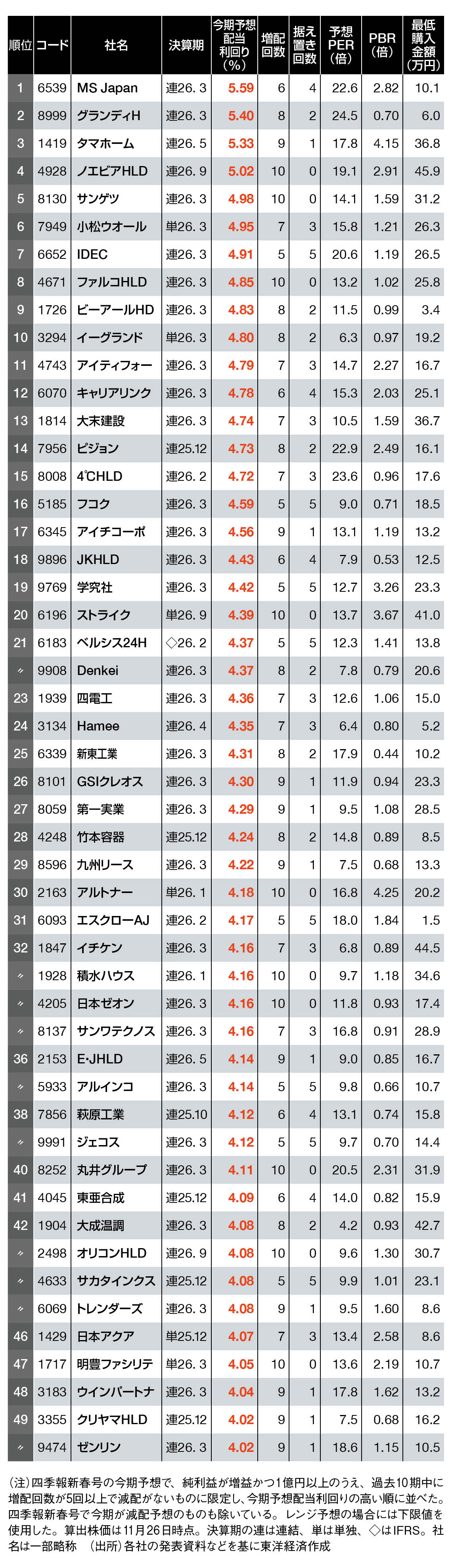 配当利回り4%以上!最新四季報「高配当利回り」銘柄TOP50 1位はMS-Japan、2位は…?