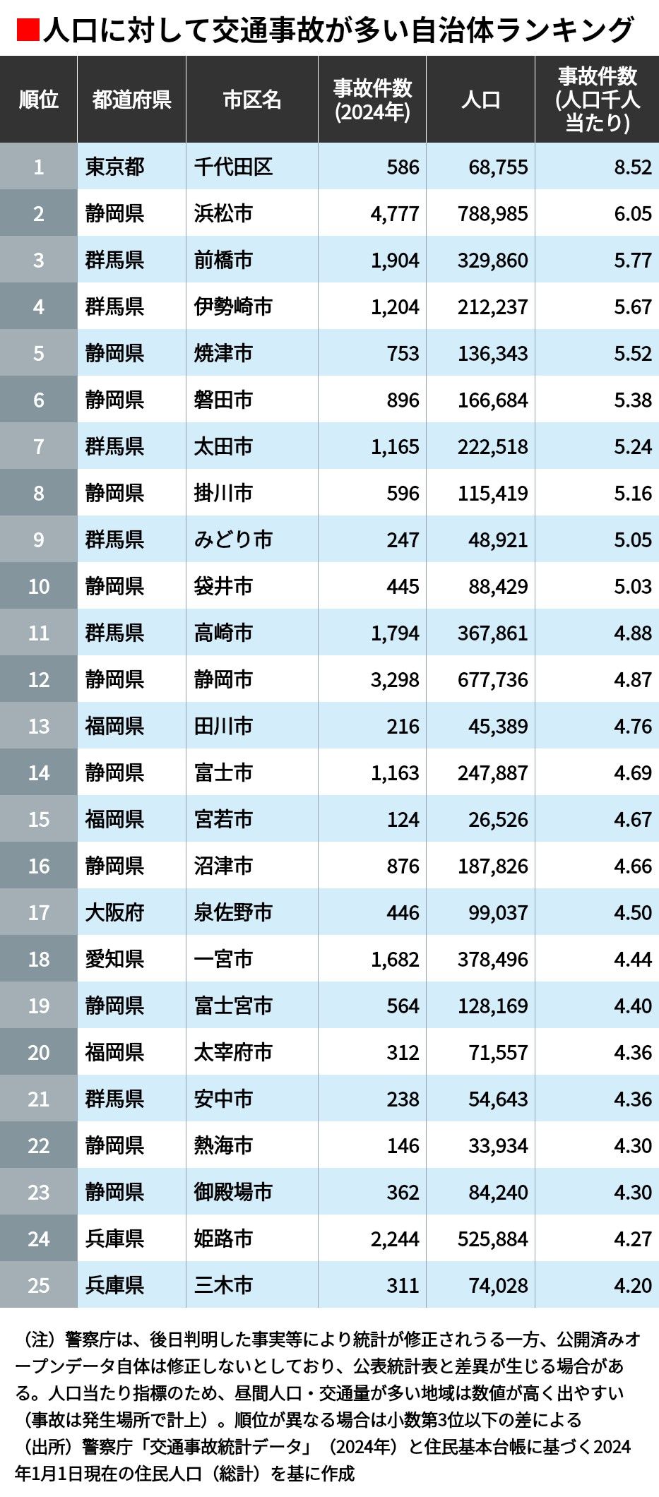 交通事故が人口に対して多い自治体ランキング 上位に入ったのはどこ?