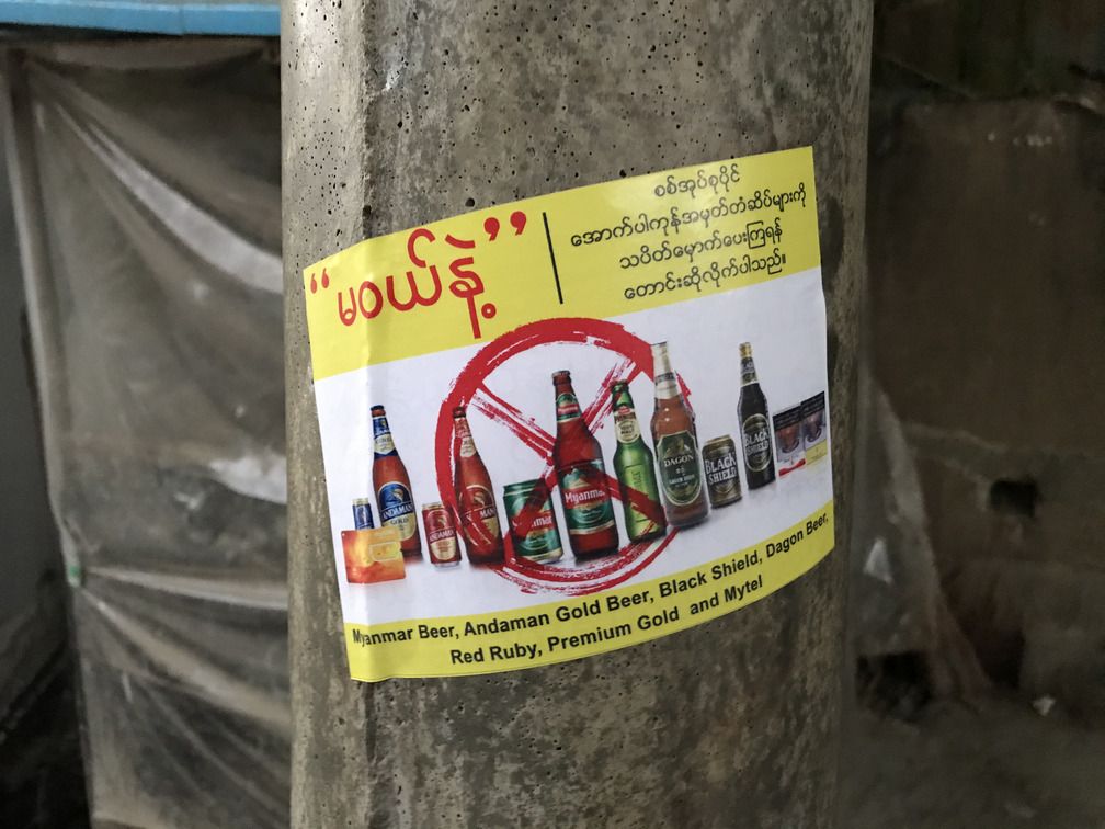 記事に戻る 《ミャンマー軍事クーデターのその後》住居、仕事、お金、すべてを奪われても不服従運動を続ける市民たち─死も「怖くない」と語る彼らの"胸中"の写真一覧 下に画像が続きます 軍系企業のミャンマーブルワリーが発売するミャンマービールなどの商品を買わないように、とボイコットを呼びかけるポスター。クーデター翌日から町のいたるところで目にした。レストランやスーパーはこうした軍系企業の商品を売らなくなった(写真:2021年2月13日、筆者撮影) 2/3
