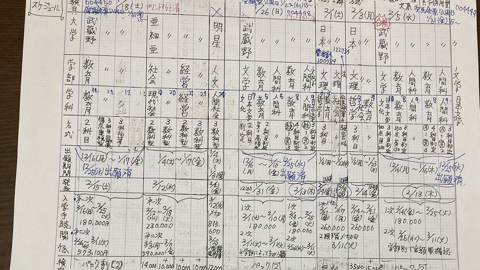 記事に戻る 「苦手な勉強を克服する」と決めた元サッカー少年、「偏差値40からの大学一般入試」挑戦、その結末〜長かった合格発表までの日々を振り返るの写真一覧 下に画像が続きます 母親がまとめていた大学受験のスケジュール表の一部(写真:山本さん提供) 2/2