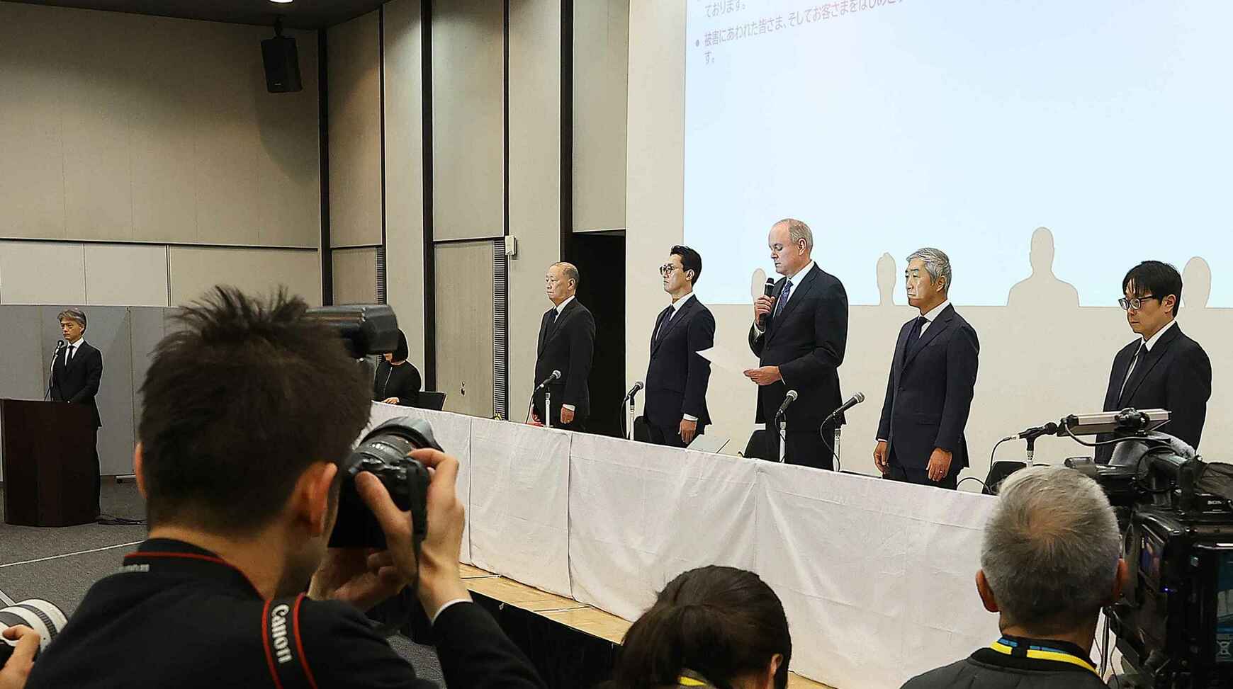 「デキるオーラ」が漂う経営陣と、オシャレなスーツが「謝罪の場にふさわしくない」と批判を浴びた司会者の姿(写真:今井康一撮影)
